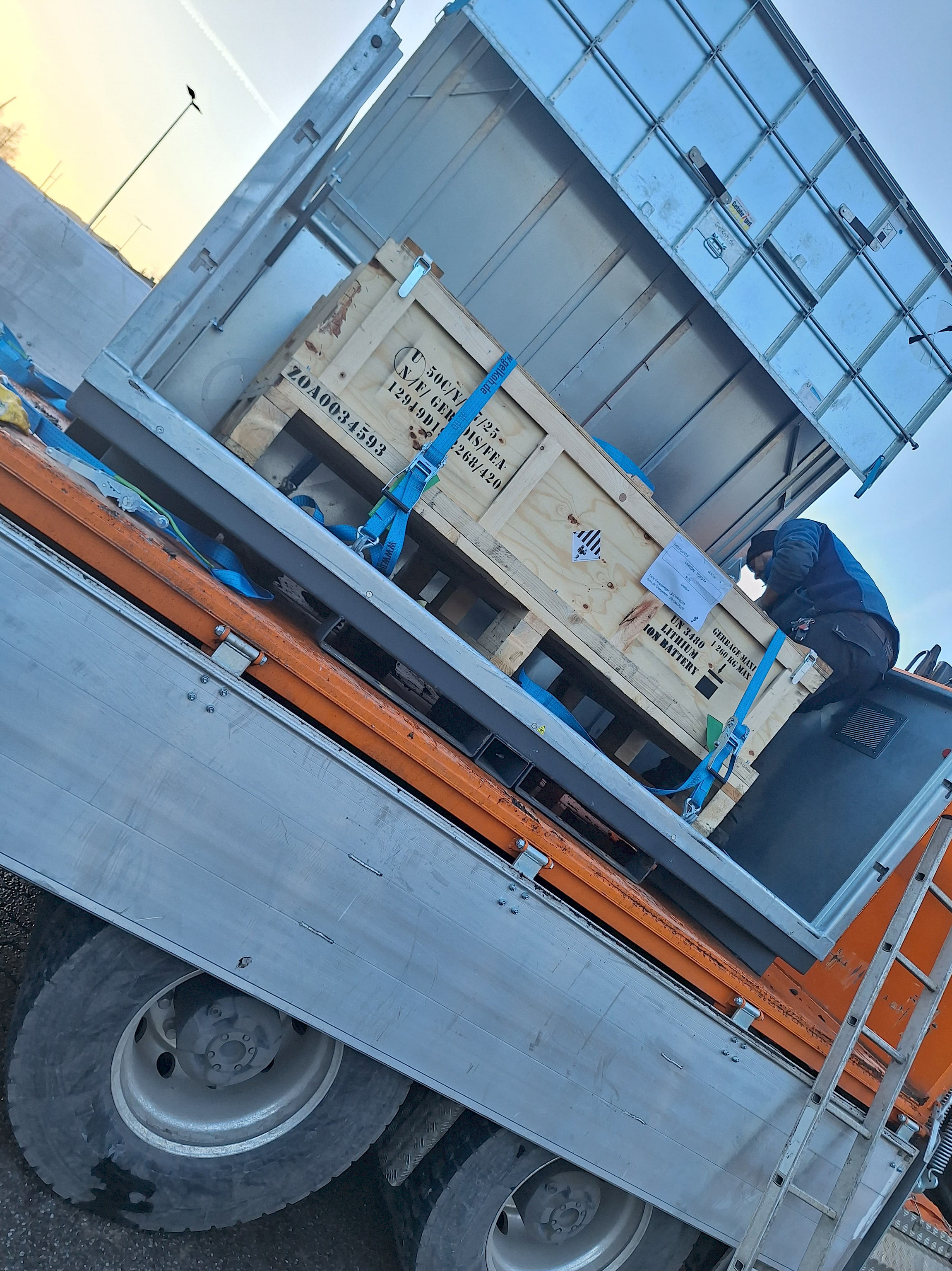 Ein aktuelles Beispiel aus unserer täglichen Arbeit zeigt, wie anspruchsvoll und verantwortungsvoll der Umgang mit diesen Batterien ist. Erst vor kurzem haben wir beim Autohaus Ploner in Telfs in Kooperation mit der ERAplus GmbH eine E-Autobatterie fachgerecht abgeholt. Die Batterie wurde in einem speziellen, brandfesten Behälter von unseren Mitarbeiter:innen gesichert und mithilfe eines Krangeräts verladen. Sicherheit hatte dabei oberste Priorität.